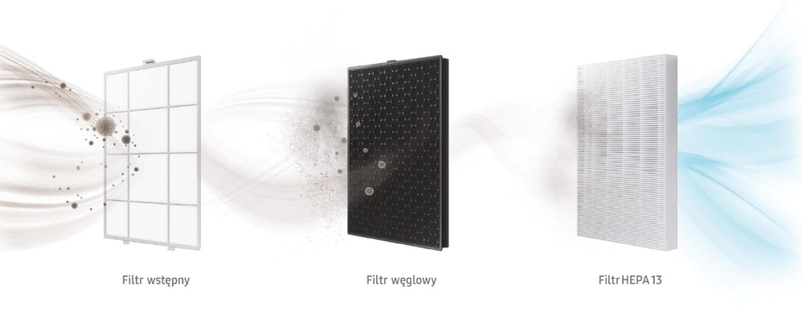 W oczyszczaczu powietrza Samsung AX60r5080wd znalazły się filtr wstępny, węglowy i HEPA H13.