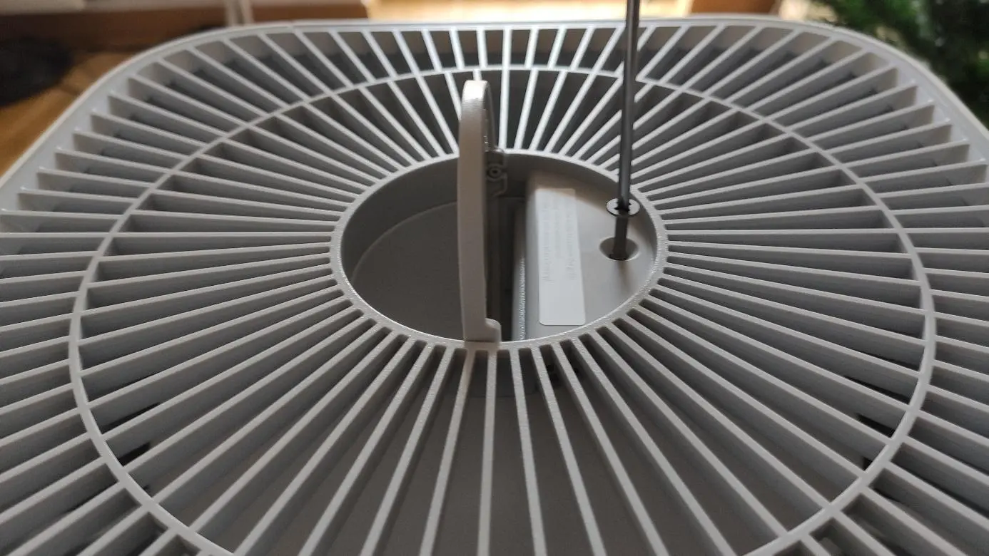 Ciekawym rozwiązaniem w Xiaomi AP 4 Pro jest z kolei otwierana klapka na górnym panelu oczyszczacza. Po odkręceniu widocznej na zdjęciu śruby, uzyskujemy dostęp do środka oczyszczacza, w tym do jonizatora powietrza.
